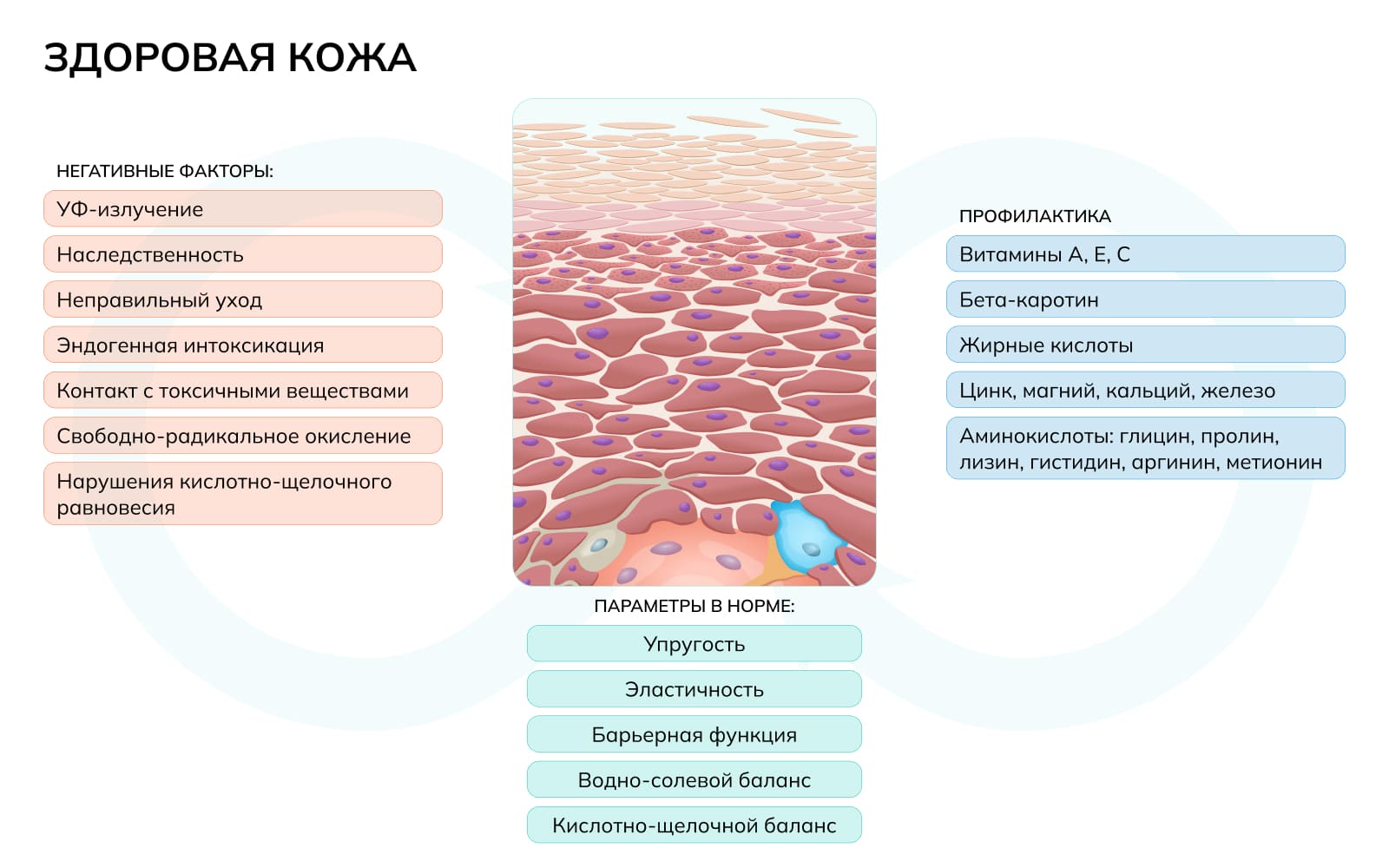 На состояние кожи влияют внешние (УФ-излучение, свободные радикалы, токсичные соединения и аллергены, механические травмы) и внутренние (гормональный и иммунный статус, генетическая предрасположенность, стресс и нарушения пищеварения) факторы. Косметический уход, своевременная диагностика и терапия заболеваний, восполнение дефицита микронутриентов уменьшают негативное действие экзо- и эндогенных факторов на кожу.