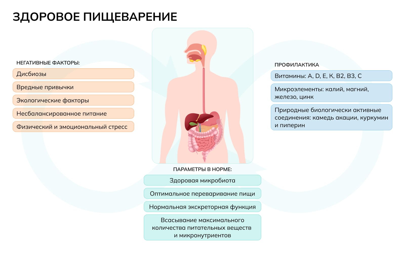 Здоровое пищеварение предполагает наиболее эффективное переваривание употребляемой пищи с извлечением полезных, обезвреживанием и удалением бесполезных / вредных соединений. Процесс пищеварения включает этапы механической и частичной ферментативной обработки пищи в ротовой полости, проглатывание и транспортировку по пищеводу в желудок, желудочное переваривание, затем переваривание в тонком и толстом отделах кишечника, накопление и экскрецию продуктов пищеварения. При нарушении на одном из этих этапов пища не будет обрабатываться в достаточной степени, что приведет не только к появлению дискомфорта, но и к снижению эффективности переваривания, т.е. организм будет получать меньше питательных соединений.