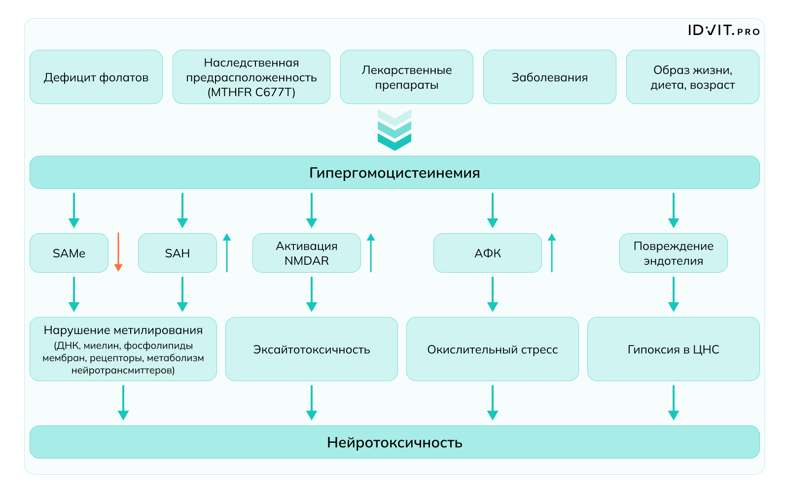 Многочисленные исследования показывают, что существует связь между дефицитом фолиевой кислоты и психическими заболеваниями, включая депрессию и биполярное расстройство, причем степень дефицита В9 коррелирует с тяжестью течения этих заболеваний. Фолат участвует в синтезе ВН4 (тетрагидробиоптерин), способствуя его регенерации из окисленной формы, и при недостатке фолата может снизиться продукция моноаминовых нейротрансмиттеров – серотонина, норадреналина и дофамина. Кроме того, доступность фолатов влияет на уровень гомоцистеина, повышенный уровень которого нарушает цикл метилирования – уровень SAH (S-аденозилгомоцистеина) повышается, а уровень SAM (S-аденозилметионина) понижается. Следствием такого дисбаланса становится активация рецепторов NMDA (N-метил-D-аспартата), которые играют ключевую роль в формировании возбуждения в нервной системе. Чрезмерная активация NMDA способствует нейрональной эксайтотоксичности и окислительному стрессу. В дополнение эндотелиальная дисфункция и повышенная продукция активных форм кислорода (ROS), связанная с гипергомоцистеинемией, могут оказывать пагубное воздействие на здоровье и целостность сосудов, нарушать кровоток и доставку питательных веществ в мозг, еще больше усугубляя повреждение нейронов и проявление психических заболеваний