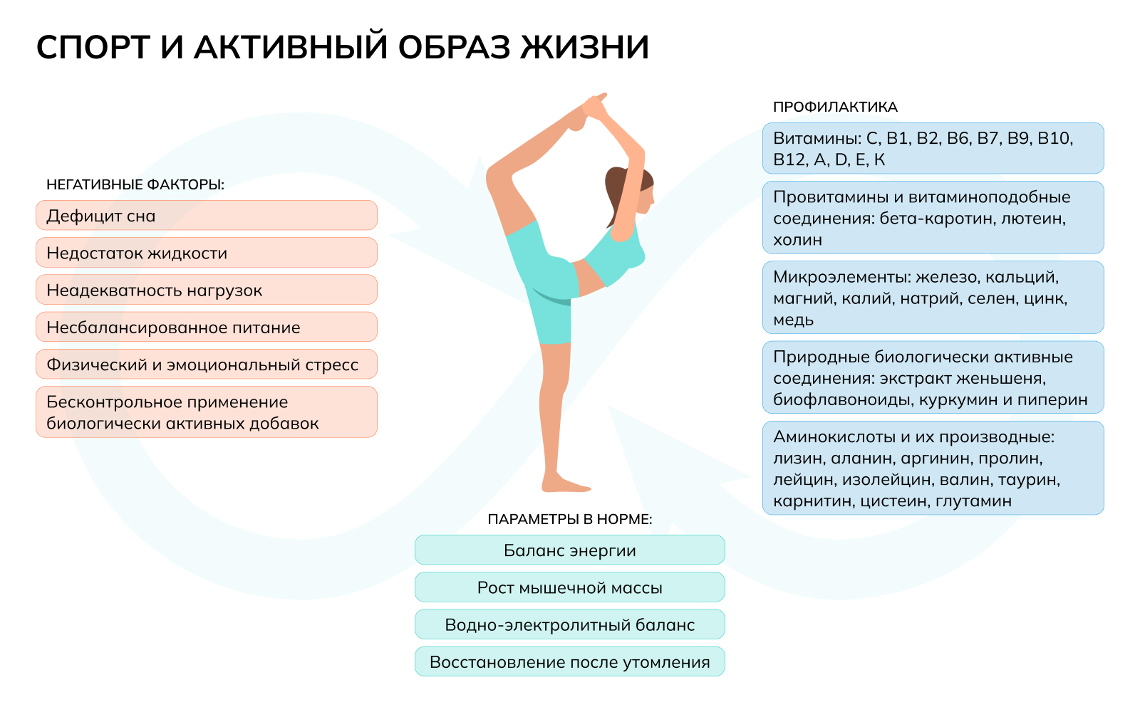 Не существует универсального рецепта для всех спортсменов, даже если нагрузки и вид спорта одинаковы, поэтому к вопросу оптимизации питания и дополнения рациона добавками микронутриентов следует подходить внимательно, опираясь на данные лабораторных исследований и объективные показатели физического состояния спортсмена. Тем не менее, можно выделить несколько групп соединений, которые по данным научной литературы оказывают наибольший положительный эффект на организм спортсмена: